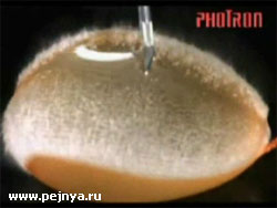 Ножик протыкает шарик с водой. Замедленная съёмка.