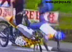 У мотоцикла на соревнованиях отваливается колесо.