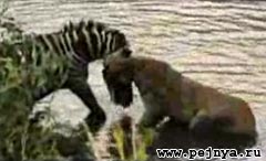 Зебра вырывается из пасти льва.